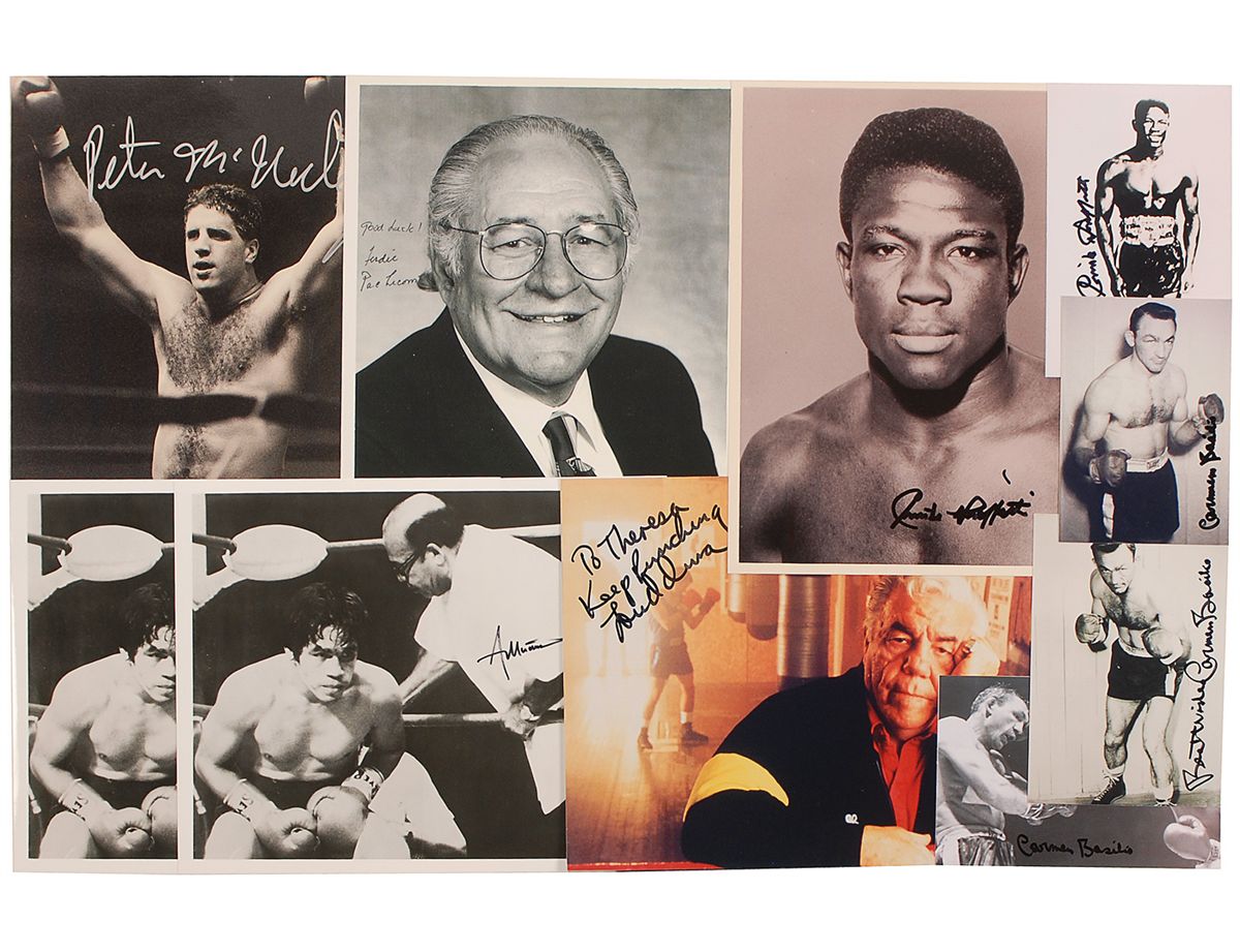 Ten signed photos, various finishes, ranging in size from 3.5 x 5 up to 8 x 10, each signed in ink or felt tip by the respective boxer pictured. Signers are: Carmen Basilio (3), Emile Griffith (2), Peter McNeely, Ferdie Pacheco, Armando Muniz (2), and Lou Duva (ins). In fine condition.