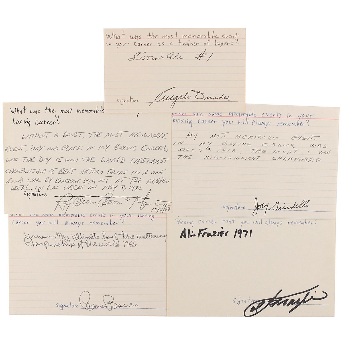 Five felt tip and ballpoint signatures on off-white 5 x 3 and 6 x 4 cards, with each boxing great writing their most memorable moment. Signers are: Joe Frazier, Carmen Basilio, Angelo Dundee, Joey Giardello, and Ray ‘Boom Boom’ Mancini. Frazier writes, “Ali-Frazier 1971”; Dundee responds, “Liston-Ali #1”; Mancini, in part, “The day I won the world heavyweight championship”; Basilio, “Winning my ultimate goal the welterweight championship of the world 1955”; and Giardello, in part, “The night I won the middleweight championship.” In overall fine condition.