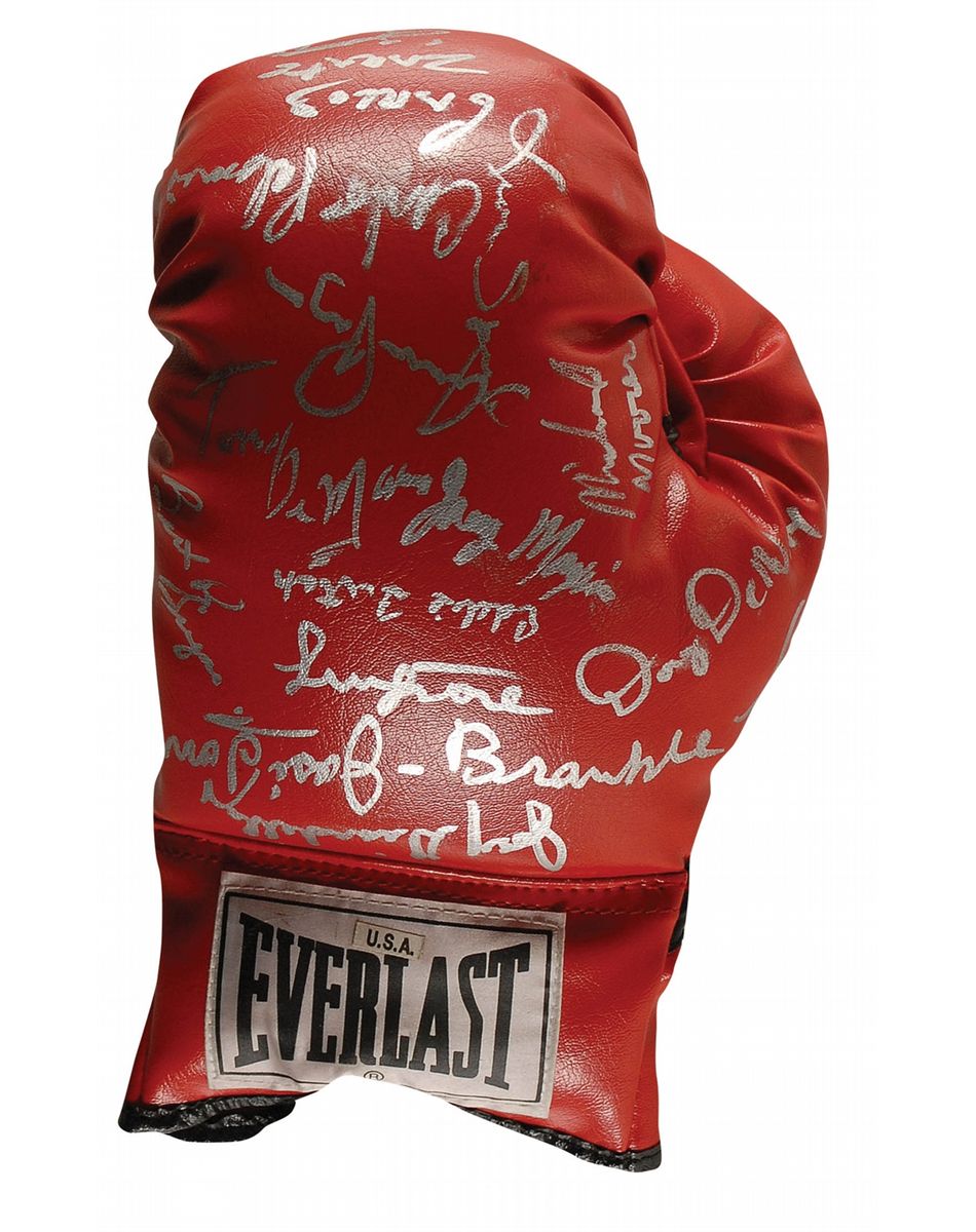 Red Everlast left-handed 14-ounce boxing glove signed in silver ink on the top by 15 boxers. Signers include: Joey Giardello, Jose Torres, Livingstone Bramble, Eddie Futch, Michael Moorer, Bert Sugar, and Leon Spinks. In fine condition, with slight brushes to a few of the signatures.
