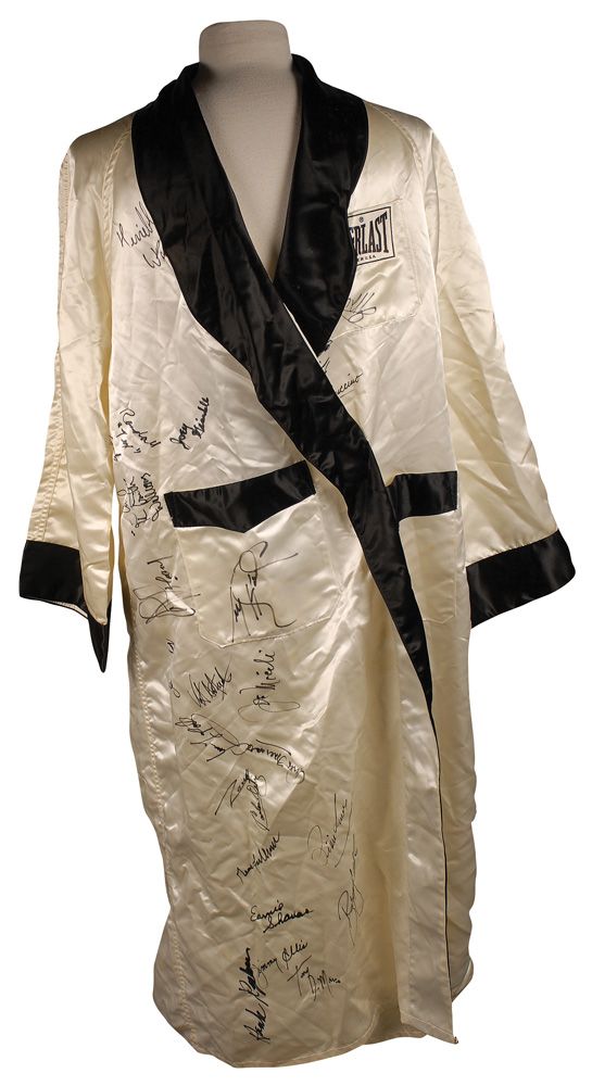 White Everlast boxing robe signed on the front in black felt tip by a number of different boxers. Signers include: Tex Cobb, Tim Witherspoon, Joey Giardello, Carl ‘The Truth’ Williams, Gerry Cooney, Larry Holmes, Carlos Ortiz, Joe Miceli, Frank Cappuccino, Gene Fullmer, Tony DeMarco, Jimmy Ellis, and Ernie Shavers. Some scattered soiling, otherwise fine condition.