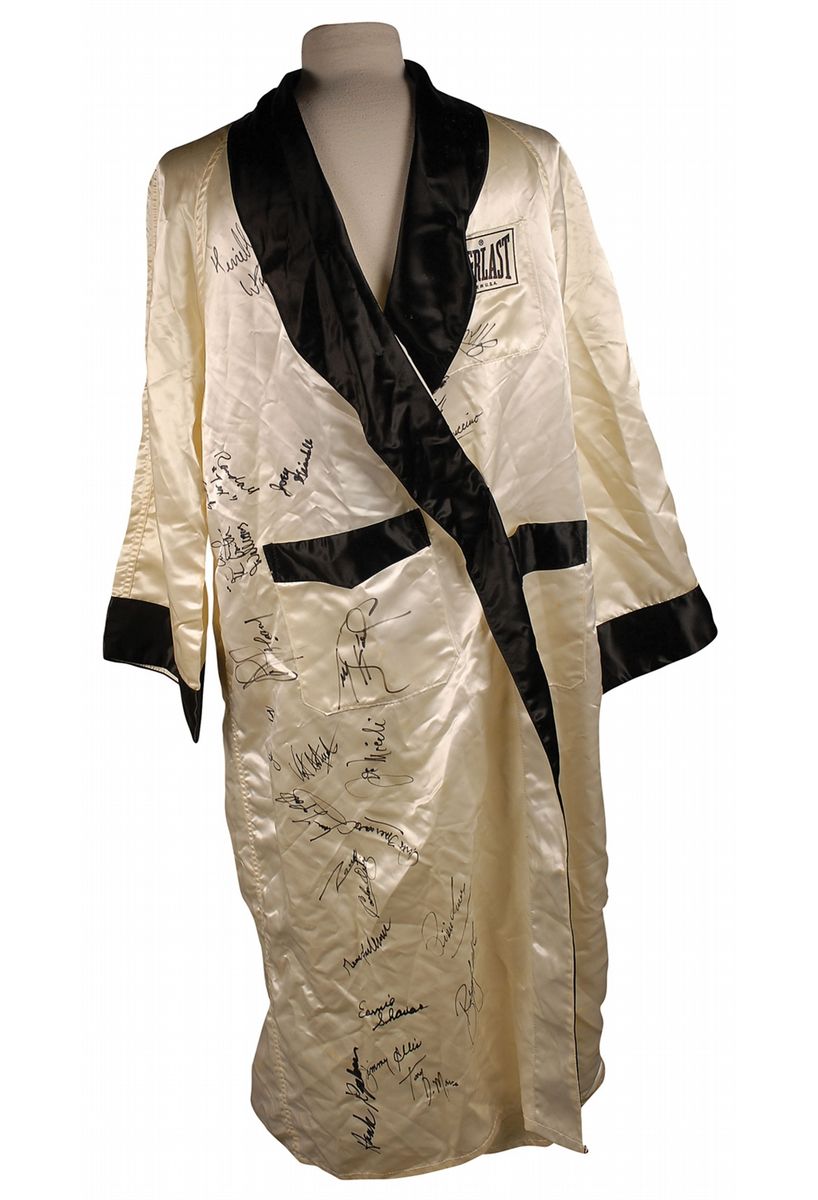 White Everlast boxing robe signed on the front in black felt tip by a number of different boxers. Signers include: Tex Cobb, Tim Witherspoon, Joey Giardello, Carl ‘The Truth’ Williams, Gerry Cooney, Larry Holmes, Carlos Ortiz, Joe Miceli, Frank Cappuccino, Gene Fullmer, Tony DeMarco, Jimmy Ellis, and Ernie Shavers. Some scattered soiling, otherwise fine condition.