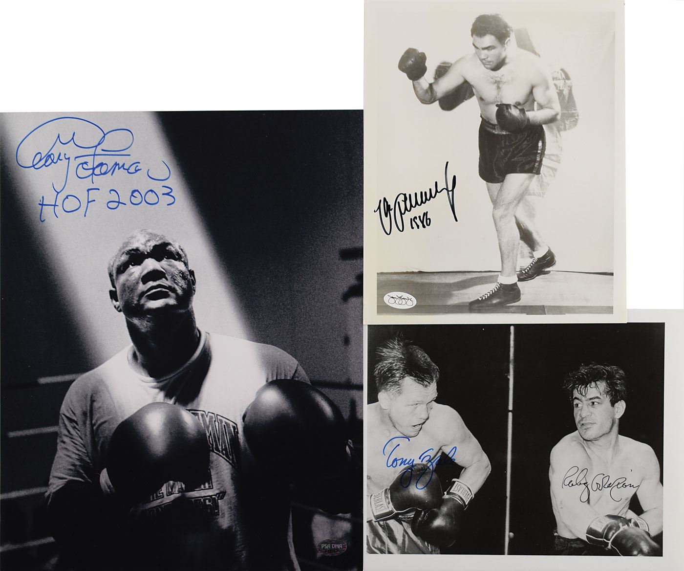 Three photos signed by legendary boxers: a glossy 11 x 14 photo of George Foreman during training, signed in blue felt tip, "George Foreman, HOF 2003"; a glossy 8 x 10 photo of Max Schmeling throwing a punch, signed in black felt tip, "M. Schmeling, 1986"; and a glossy 10 x 8 photo of a bout between Rocky Graziano and Tony Zale, signed in felt tip by both. In fine condition, with a PSA/DNA label affixed to the corner of the Foreman photo, and a JSA label affixed to the Schmeling photo. Accompanied by a certificate of authenticity from PSA/DNA for Foreman.