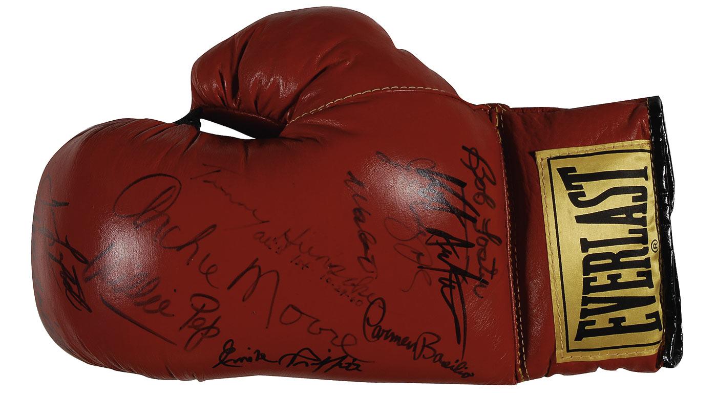 Everlast left-handed 12-ounce boxing glove, signed in black felt tip on the top by Vito Antuofermo, Bob Foster, Carmen Basilio, Emile Griffith, Willie Pep, Juan LaPorte, Chris Smith, Archie Moore, Jersey Joe Walcott, and Tunney Hunsacker (adding “Ali’s 1st 10-29-60”). In fine condition, with some of the signatures a few shades light. Pre-certified Steve Grad/PSA/DNA and RRAuction COA.