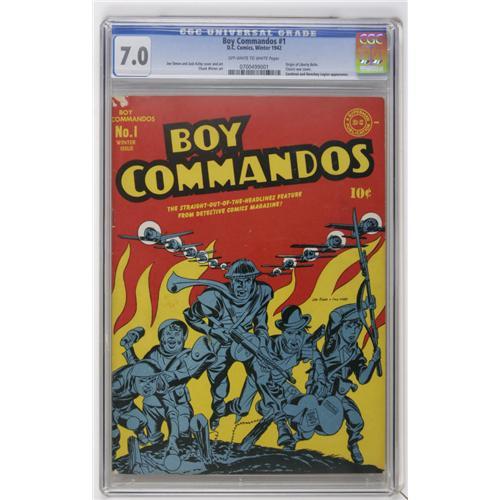 <B>Boy Commandos #1 (DC, 1942) CGC FN/VF 7.0 Off-white to white pages.</B></I> One of the first titles that collectors think of when the legendary team of Joe Simon and Jack Kirby is discussed is <B>Boy Commandos</B></I>. Overstreet calls the cover 'classic' and who could argue? This premiere issue also features the origin of Liberty Belle, plus appearances by Sandman and the Newsboy Legion. Overstreet 2006 FN 6.0 value = $1,563; VF 8.0 value = $3,647. CGC census 12/06: 5 in 6.5, 8 higher.<BR><BR><b>Shipping:</b> Slabbed Comic (<a target="_blank" href="http://www.heritageauctions.com/common/shipping.php">view shipping information</a>)