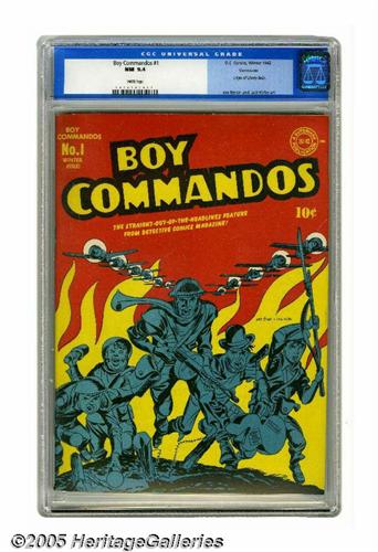 <B>Boy Commandos #1 Vancouver pedigree (DC, 1942) CGC NM 9.4 White pages.</B></I> With the grade and the page quality, one would suspect one of the more renowned pedigrees, but this copy should call attention to the quality of the Vancouver pedigree. CGC has certified only two copies of this premiere issue with grades higher than VF 8.5, none higher than this stellar copy. The Overstreet "classic" cover from Joe Simon and Jack Kirby is backed by a Sandman and Newsboy Legion crossover appearance in the Boy Commandos story, and by the origin story of Liberty Belle. Overstreet 2005 NM- 9.2 value = $8,200. CGC census 5/05: 2 in 9.4, none higher.