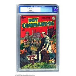 Boy Commandos #12 (DC, 1945) CGC VF- 7.5 Off-white pages. Someone signed "Simon & Kirby" on this cover, but Overstreet warns us that the famous duo took a break from issue #10 until #13. Nice, bright colors define this copy, especially the deep red sky background. Nothing like an unnaturally red sky in the morning, unless it's capped by a mushroom-shaped cloud! This copy is edged out by only one other of this issue, on the basis of the most recent CGC census data available at this writing. Overstreet 2002 VF 8.0 value = $220. Important notice: We expect to be auctioning lots at the rate of 200-250 per hour. Sometimes eBay Premier live bid software cannot keep up with that pace, so we strongly recommend that you place a realistic proxy bid now as insurance to avoid disappointment. Also please note that all Heritage/CAA lots purchased through eBay Premier carry a 20% Buyer's Premium. Please make sure you read the Terms and Conditions.