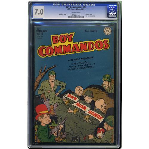 <B>Boy Commandos #13 (DC, 1945) CGC FN/VF 7.0 Off-white pages.</B></I> Last World War II cover in this series. Overstreet 2006 FN 6.0 value = $120; VF 8.0 value = $234. CGC census 2/06: 2 in 7.0, 5 higher. <I>From the Collection of Harold Curtis.</B></I>