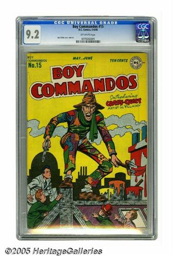 <B>Boy Commandos #15 (DC, 1946) CGC NM- 9.2 Off-white pages.</B></I> The Boy Commandos' arch nemesis Crazy-Quilt makes his debut in this issue, and Jack Kirby's colorful, dramatic cover introduces the villain with style. Kirby also provides the interior art. Overstreet 2005 NM- 9.2 value = $475. CGC census 7/05: 2 in 9.2, 1 higher.