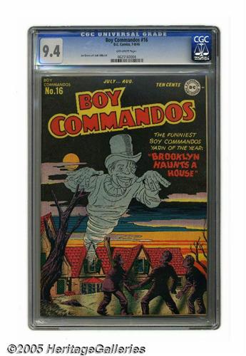<B>Boy Commandos #16 (DC, 1946) CGC NM 9.4 Off-white pages.</B></I> After a successful start on <B>Detective Comics</B></I>, Simon and Kirby's team of youngsters wowed readers for six years in their own series. This issue is stunning, exhibiting a perfect spine and razor-sharp edges. This is the highest-graded copy by CGC as of this writing, and in NM 9.4, could be the nicest in existence. Overstreet 2005 NM- 9.2 value = $340. CGC census 1/05: 1 in 9.4, none higher.