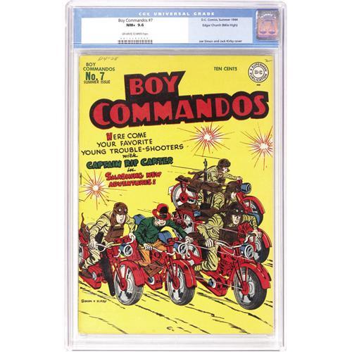 <B>Boy Commandos #7 Mile High pedigree (DC, 1944) CGC NM+ 9.6 Off-white to white pages.</B></I> This copy's brilliant cover colors, silky-smooth surfaces, and sharp edges tell you this must be from the legendary Edgar Church Mile High collection; now it's time to add it to <I>your</B></I> longbox with a winning bid! Of course, the cover is by the group's creators, Simon and Kirby. Overstreet 2006 NM- 9.2 value = $700. CGC census 5/06: 2 in 9.6, none higher. <BR><BR><B>Important notice:</B> Heritage usually auctions material at the rate of 200-250 lots per hour. On some occasions eBay Live bid software or the Internet may not be able to keep up with the pace of the auction. We recommend placing a realistic absentee bid now as insurance to avoid disappointment. Occasionally the auctioneer may eliminate or reject an eBay Live bid, and the auctioneer may also reopen a lot after the close of the eBay live bidding (usually because we missed an audience bid), and may reject your bid even if it shows you as the winning bidder. By bidding via eBay Live, you agree that Heritage may award the lot to another bidder at its sole discretion under the circumstances described above or any other reasonable circumstances. Since eBay bids are not shown to us until we open the lot on the floor, we treat those bids just like floor bids. In most cases the floor responds before the eBay bid is presented to us, due to Internet lag time, so for consistency we have made it a policy that floor bids are always considered first over tie eBay live bids. Also please note that all Heritage lots purchased through eBay Live carry a 22.5% Buyer's Premium. Please make sure you read the Terms and Conditions before you bid. This lot is being auctioned in conjunction with a live floor auction by Heritage Auction Galleries. All final auction and invoice information will be supplied by Heritage Auction Galleries, and all other information should be considered preliminary. Lot:41001 <BR><BR><B>Winning Notification and Billing:</B> After the FINAL session in this auction is complete, Heritage will send e-mail and snail mail invoices. This process normally takes several days. All final auction and invoice information will be supplied by Heritage Auction Galleries, and all other information should be considered preliminary. <BR><BR>This auction will be conducted on a live auction floor and over the Internet through eBay Live. If you choose to place an absentee bid, please take a moment to <font color='#0000ff'><u><a href='http://pages.ebay.com/liveauctions/help/before/laabsentee.html'>learn how eBay Live absentee bidding works</a></u></font><font color='#000000'>