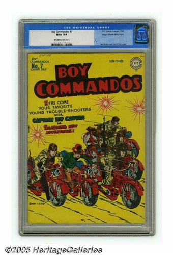 <B>Boy Commandos #7 Mile High pedigree (DC, 1944) CGC NM+ 9.6 Off-white to white pages.</B></I> Here they come, roaring your way -- it's the Boy Commandos, riding to victory on this cool World War II cover by Joe Simon and Jack Kirby. The brilliant cover colors, silky-smooth surfaces, and sharp edges tell you this must be from the legendary Edgar Church Mile High collection; now it's time to add it to yours with a winning bid! Overstreet 2005 NM- 9.2 value = $675. CGC census 6/05: 2 in 9.6, none higher.