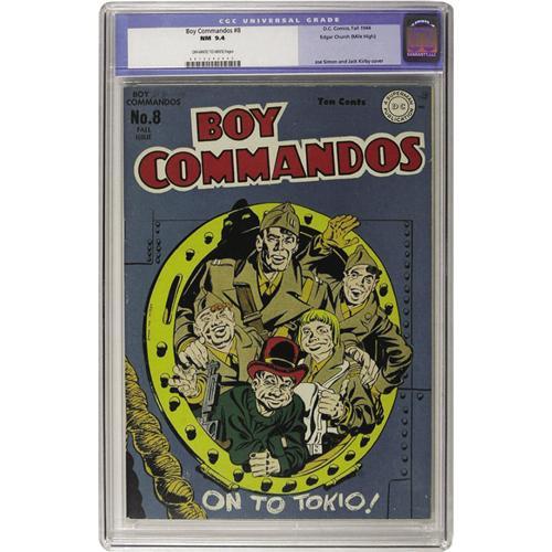 <B>Boy Commandos #8 Mile High pedigree (DC, 1944) CGC NM 9.4 Off-white to white pages.</B></I> The boys are "on to Tokio" (sic) on this great World War II cover by Joe Simon and Jack Kirby. Deep, rich color makes this cover really "pop" - you know you've got an Edgar Church Mile High book with this one! CGC currently lists no higher-graded copies of this issue. Overstreet 2006 NM- 9.2 value = $700. CGC census 6/06: 1 in 9.4, none higher. <BR><BR><B>Important notice:</B> Heritage usually auctions material at the rate of 200-250 lots per hour. On some occasions eBay Live bid software or the Internet may not be able to keep up with the pace of the auction. We recommend placing a realistic absentee bid now as insurance to avoid disappointment. Occasionally the auctioneer may eliminate or reject an eBay Live bid, and the auctioneer may also reopen a lot after the close of the eBay live bidding (usually because we missed an audience bid), and may reject your bid even if it shows you as the winning bidder. By bidding via eBay Live, you agree that Heritage may award the lot to another bidder at its sole discretion under the circumstances described above or any other reasonable circumstances. Since eBay bids are not shown to us until we open the lot on the floor, we treat those bids just like floor bids. In most cases the floor responds before the eBay bid is presented to us, due to Internet lag time, so for consistency we have made it a policy that floor bids are always considered first over tie eBay live bids. Also please note that all Heritage lots purchased through eBay Live carry a 22.5% Buyer's Premium. Please make sure you read the Terms and Conditions before you bid. This lot is being auctioned in conjunction with a live floor auction by Heritage Auction Galleries. All final auction and invoice information will be supplied by Heritage Auction Galleries, and all other information should be considered preliminary. Lot:41001 <BR><BR><B>Winning Notification and Billing:</B> After the FINAL session in this auction is complete, Heritage will send e-mail and snail mail invoices. This process normally takes several days. All final auction and invoice information will be supplied by Heritage Auction Galleries, and all other information should be considered preliminary. <BR><BR>This auction will be conducted on a live auction floor and over the Internet through eBay Live. If you choose to place an absentee bid, please take a moment to <font color='#0000ff'><u><a href='http://pages.ebay.com/liveauctions/help/before/laabsentee.html'>learn how eBay Live absentee bidding works</a></u></font><font color='#000000'>