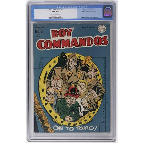 <B>Boy Commandos #8 Mile High pedigree (DC, 1944) CGC NM 9.4 Off-white to white pages.</B></I> The boys are "on to Tokio" (sic) on this great World War II cover by Joe Simon and Jack Kirby. Deep, rich color makes this cover really "pop" -- you know you've got an Edgar Church Mile High book with this one! CGC currently lists no higher-graded copies of this issue. Overstreet 2006 NM- 9.2 value = $700. CGC census 03/06: 1 in 9.4, none higher.