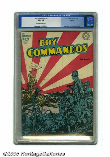 <B>Boy Commandos #9 Hawkeye pedigree (DC, 1944) CGC NM- 9.2 Off-white to white pages.</B></I> Simon and Kirby were never lacking for an original twist, and for this cover they even departed from their usual kinetic action, producing a war cover of powerful dramatic impact. Only one copy of this issue has been certified with a higher grade by CGC to date. Overstreet 2005 NM- 9.2 value = $675. CGC census 2/05: 2 in 9.2, 1 higher.