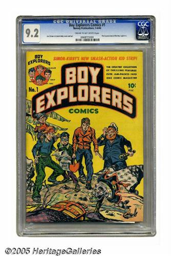 <B>Boy Explorers Comics #1 (Harvey, 1946) CGC NM- 9.2 Cream to off-white pages.</B></I> It seems that Simon and Kirby never worked for a publisher without giving them at least one kid group. S & K's Harvey stint resulted in this issue, the debut of the Boy Explorers. The cover and interior art are by S&K. Overstreet 2005 NM- 9.2 value = $875. CGC census 7/05: 3 in 9.2, 2 higher.