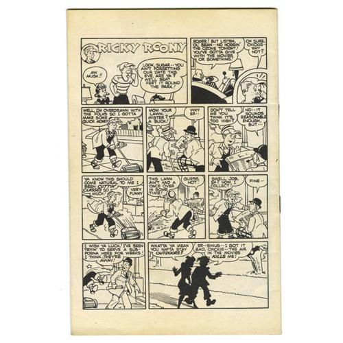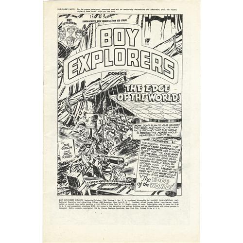 <B>Boy Explorers Comics #2 File Copy (Harvey, 1946) Condition: VF/NM.</B></I> A Harvey file copy is a nice acquisition in any case, but having a file copy is of critical importance here! That's because a black and white comic like this one is difficult if not impossible to authenticate (CGC will not encapsulate #2 for that reason), and provenance is therefore of the essence. This Simon and Kirby issue, a 32-pager measuring 5 1/2 x 8 1/2 inches, is rated "scarce" by Overstreet, and Gerber assigned it an "8." That's because it never even hit newsstands -- as the publisher's note explains, "For the present emergency, newsstand sales will be temporarily discontinued and subscribers alone will receive copies of these issues." The "emergency" was simply that after paper rationing was discontinued, the major publishers flooded the market with comic series in an effort to squeeze out competition, and newsdealers only had room for top sellers. That meant the end not only of this series, another fledgling S&K effort, <B>Stuntman</B></I>, and a couple of other Harvey titles. This is undoubtedly one of the toughest items to find for the Jack Kirby completist, and the unquestioned authenticity of this copy means that Harvey collectors, S&K fans, and rarity-hunters should be zeroing in on this one. Overstreet 2006 VF/NM 9.0 value = $988; NM- 9.2 value = $1,350.