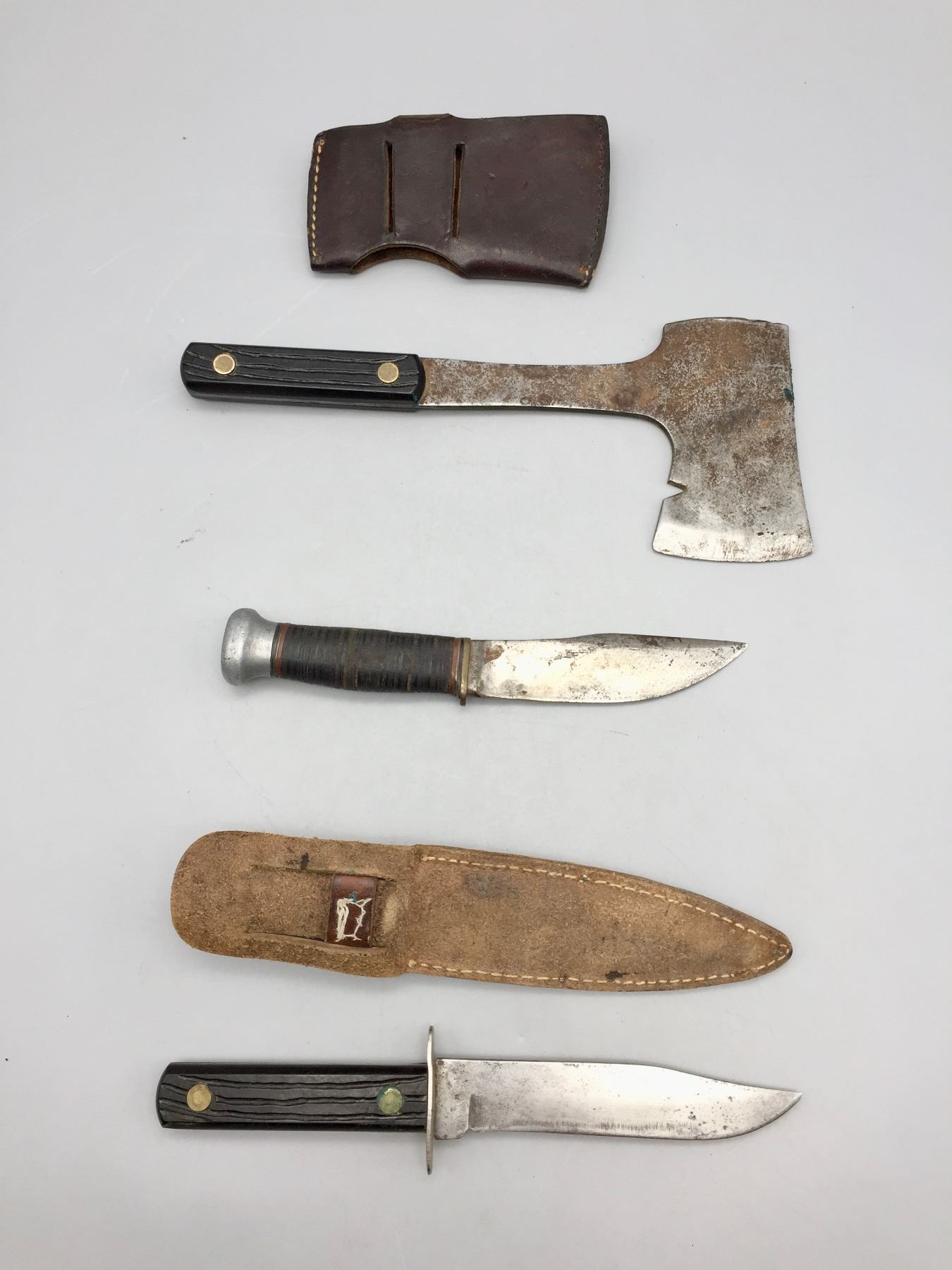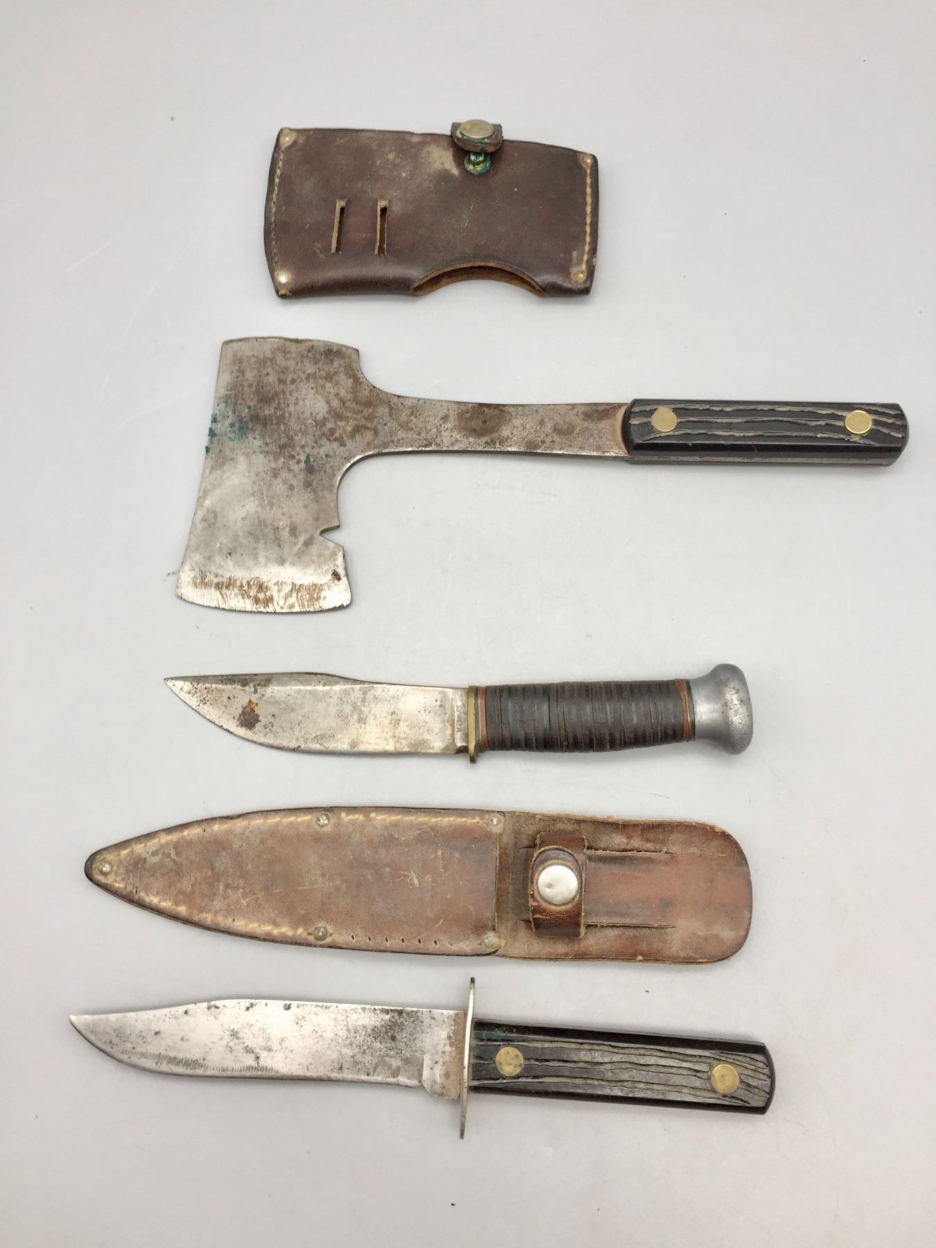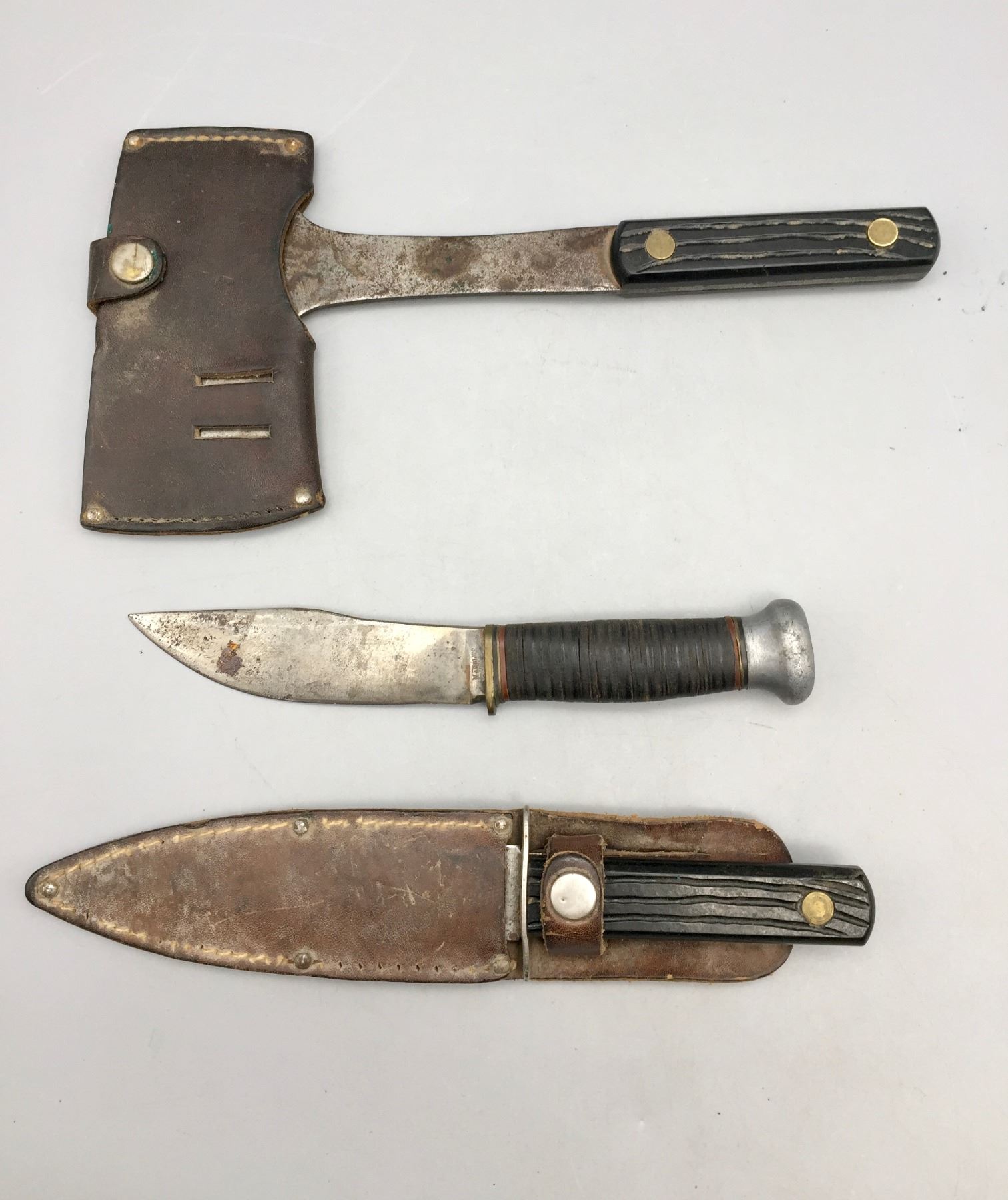 Size: Sheathed knife is 5" long. Knife is 4-1/4" long. Hatchet is 10-1/2" long. Condition: Pretty good for their ages, normal wear expected. Please look closely at the pictures - they are an important part of our description.