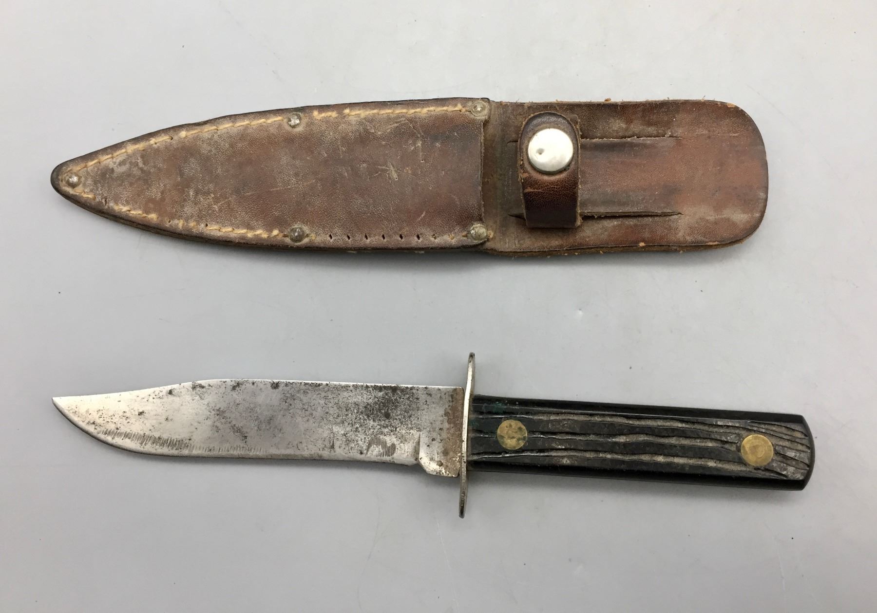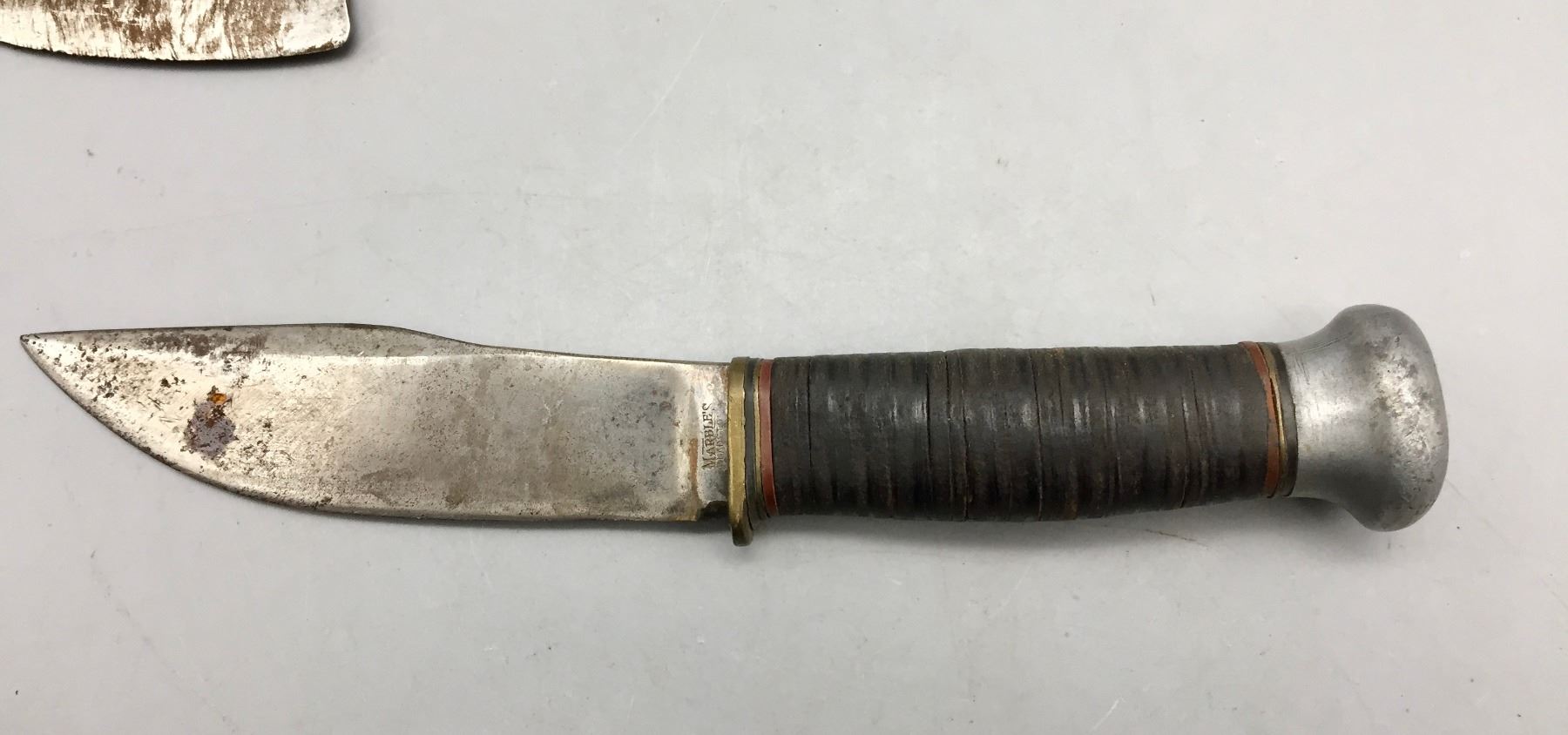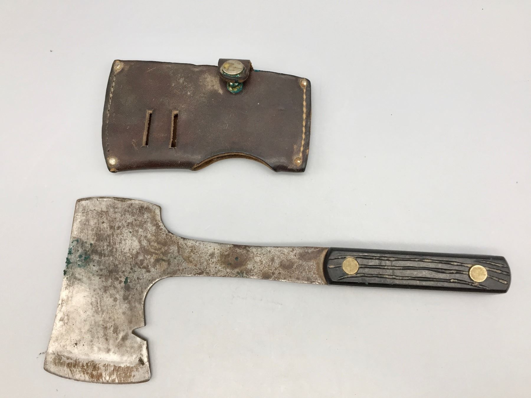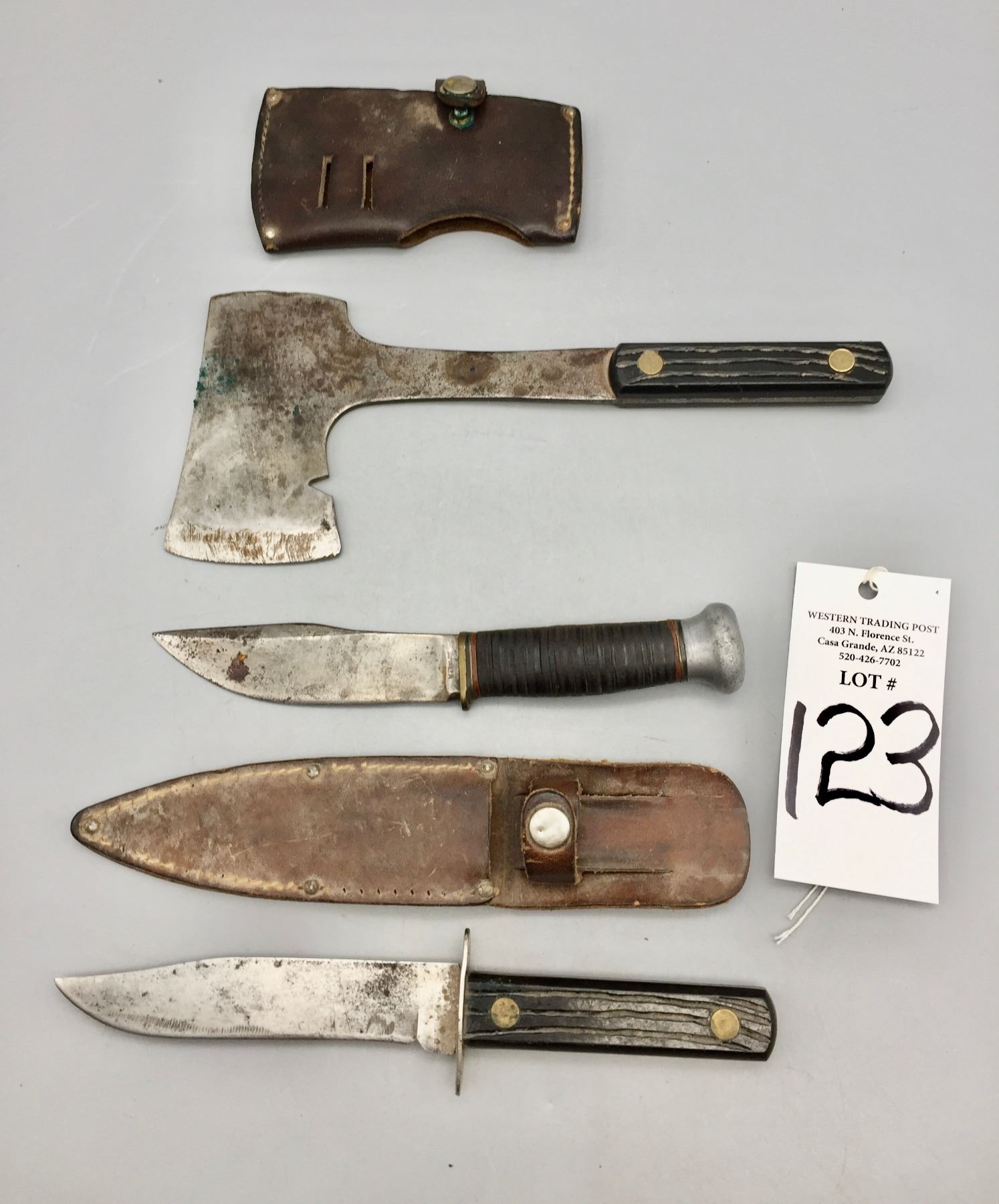 Size: Sheathed knife is 5" long. Knife is 4-1/4" long. Hatchet is 10-1/2" long. Condition: Pretty good for their ages, normal wear expected. Please look closely at the pictures - they are an important part of our description.