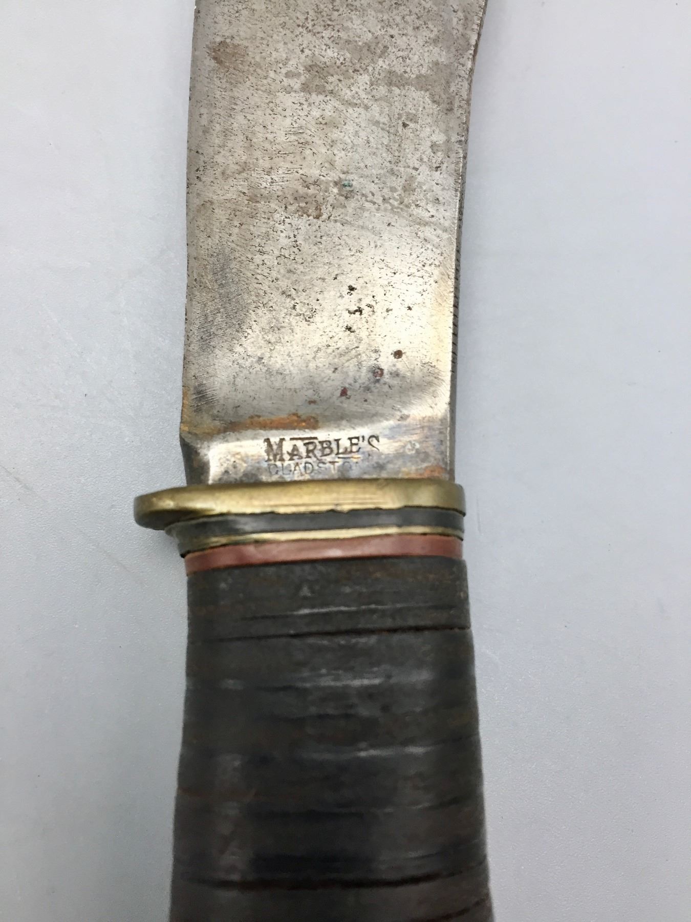 Description: Included for sale in this lot is an old Boy Scout Hatchett and matching knife with a leather sheath along with another old Marble's Gladstone fixed blade knife with stacked leather handle. Maker: One knife was made by Marble's Gladstone. Approx. Age: Vintage.