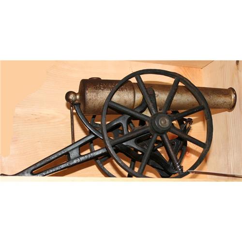 Boy Scout Machine Gun is in raised letters on both sides of cannon replica.  Remnants of what appears to be brass colored paint on barrel.  Wooden wheels have 8" D.  Overall length approximately 18".  Made in U.S.A. Oct. 28, 1913.  Designed for firing.