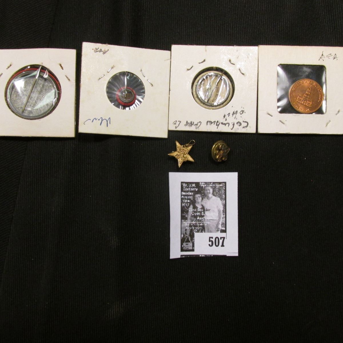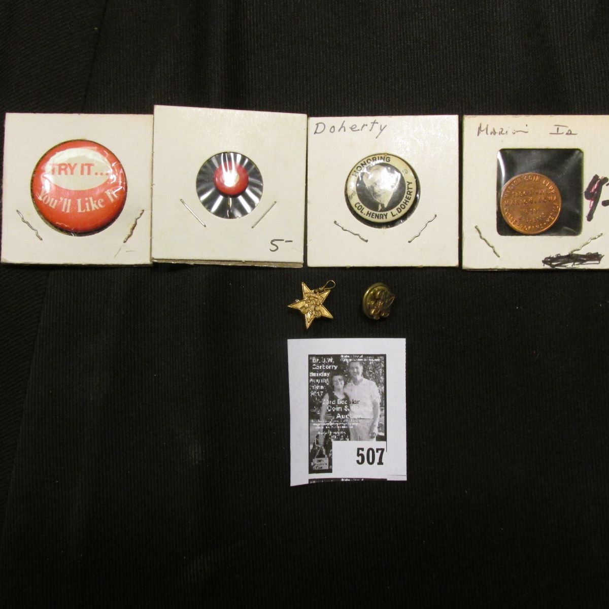 Boy Scout Pin-back; star shaped Boy Scout pendant; Pin-back "Honoring Col. Henry L. Doherty", Columbus, Ohio; "Try It…You'll Like It" pin-back; 1776-1976 United States Bicentennial Medal; & a Red-white circular Pin-back.