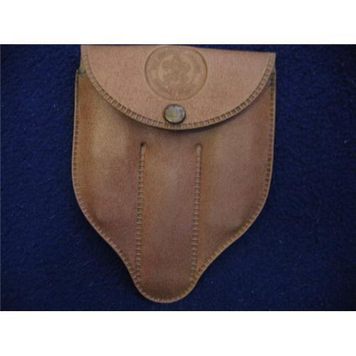 This pliable plastic case is embossed with a stamp that reads "Boy Scouts of America National Council" with the fleur de lys in the center. The case is tan and has a brass snap closure. Inside are a knife, fork, and spoon. The fork is a little over 6 inches when unfolded; there is a can opener on the handle; the words "stainless pat. appl'd" are engraved on it; and it has a good spring action for folding and unfolding. The knife extends to 6 inches and is marked stainless Imperial; the boy who used this kit faintly scratched his unit name, "Winter Bourne," on each piece--which, I think, adds to the charm. The 5 inch spoon is marked Stainless by Imperial USA. Both the knife and the fork are stamped with the boy scout fleur de lys, which is surrounded by: "Boy Scouts of America Nat. Coun. N.Y.C." The utensils are in very good condition. The case has 4 slits on the back to weave a belt through. The upper side seams of the case are split (about a half inch down on one side, and a quarter inch down on the other) from use. I estimate that this kit is from the 1950s to 1960s. Please check my site for other Boy Scout collectibles I will be posting soon!