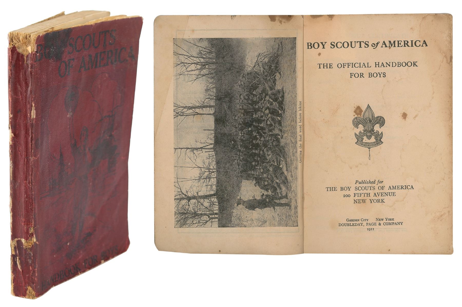 Scarce book: Boy Scouts of America: The Official Handbook for Boys. First edition. Garden City, NY: Doubleday, Page & Company, 1911. Softcover bound in maroon wrappers, 5 x 7.25, 404 pages. In good to very good condition, with significant wear to covers, creasing to pages, and cracks and losses to spine; the binding remains tight. This is the first edition of the first issue of the Boy Scout handbook, the Boy Scouts of America having been founded a year earlier in 1910. Approximately 100,000 copies were issued in olive drab wrappers, while a scant 5,250 were released in maroon. This is a generally well-preserved example of a very condition-sensitive book.