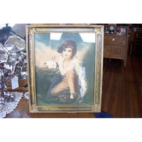 A lovely print with the subject matter titled: A Boy With Rabbit. The artist was Sir Henry Raeburn of Scotland and the print is estimated ca 1909. The subject was Raeburn's stepson who was deaf. Sir Henry Raeburn is perhaps the most well known Scottish painter. He certainly is one of the most highly guarded Scottish portrait painters. He was born in Stockbridge near Edinburgh. This Print comes with the original Wood Frame accented in Golds and Bronze tones. It was professionally framed and has the original paper sticker on the back which reads: National Service of the Print Guild of America. The whole framed print measures 18 1/2" ny 15 1/2" with the inside measuring 16 x 19. Due to the age of this frame there are some knicks and chips along the sides of this frame. There is a water mark in the lower left corner, but very faint, it merely shows the outline of the watermark and have tried to show this in my image. I acquired it at an estate auction. The brief history about the artist and print comes with this piece as I have included from my research. This framed print would make a lovely addition to an older or new home due to the subject matter.