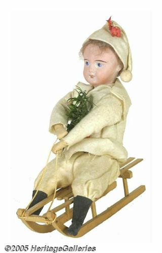 <B>Boy on Sled with Tree Candy Container</B></I> The container separates at the boy's waist to expose the secret cardboard candy holder. His hand-painted porcelain face and winter suit are very detailed in design right down to a small flower on his hat and belt. The hands are pipe-cleaner type and hold the leads to the sled. A small piece of tree is held against his chest. Near mint and making a very impressive display piece for anyone's Christmas. Lot:252