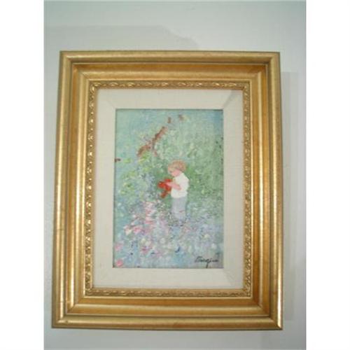 Lillian D. August(b.1927) A very precious portrait of a little boy holding a bird (Cardinal)in a field. Excellent condition. Measures 7"x5".Oil on canvas. Miss August is known for her paintings of chilren.Signed "August" lower right.