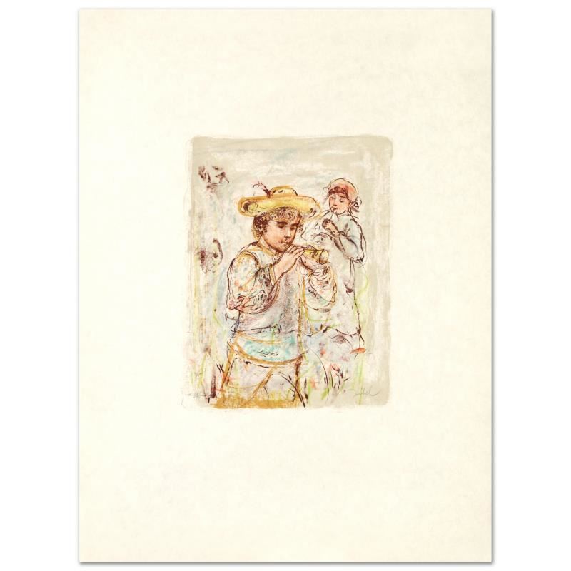 "Boy with Horn" is a limited edition lithograph on rice paper, numbered and hand signed by Edna Hibel (1917-2014). Includes Certificate of Authenticity! Measures approx. 22.5" x 30" (with border), 11" x 14.5" (image).