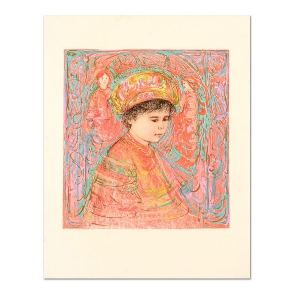 "Boy with Turban" is a limited edition lithograph on paper by Edna Hibel (1917-2014), numbered and hand signed by the artist. Includes Certificate of Authenticity. Measures approx. 22" x 17" (border), 14" x 15" (image). ** Please note: There are creases in the border area. **