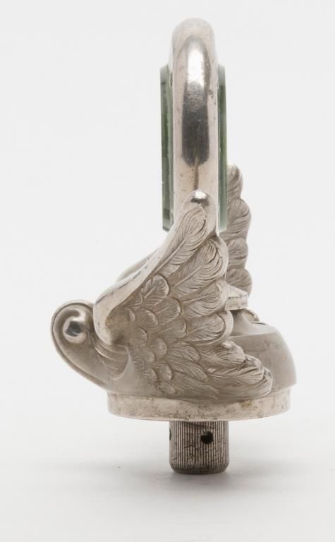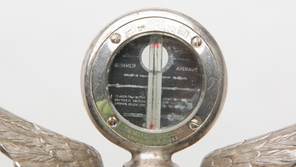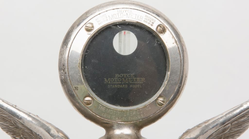Boyce MotoMeter Standard Model. 1920’s era radiator temperature gauge for high-end automobiles. The MotoMeter is in overall very good condition with beveled glass front and rear faces showing a couple of minor flea bites. Thegauge features beautifully articulated feathered wings which retain the majority of their original finish. A neat piece patented in 1912, the MotoMeter was used throughout the roaring 20’s. Est.: $150-$300.