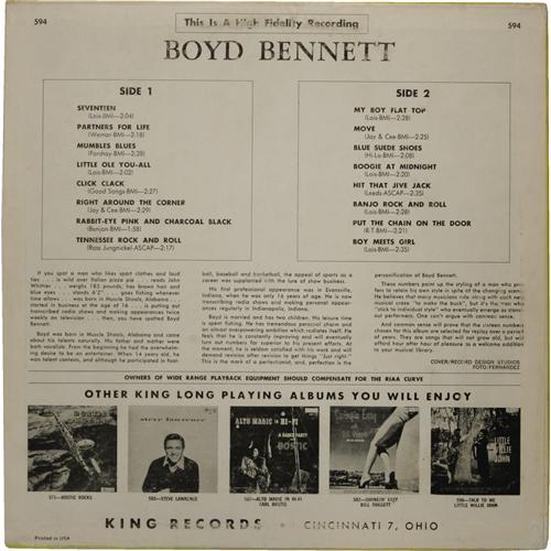 <B>"Boyd Bennett" LP (King 594, 1955).</B></I> One of the real rarities from the mid-1950s is Boyd Bennett's only album. Boyd Bennett and His Rockets charted 3 songs in 1955 and 1956, including the #5 smash "Seventeen", and all are included here. Condition: EX 7/ EX 7. <I>From the GRT Collection.</B></I><BR><BR><b>Shipping:</b> Recordings (<a target="_blank" href="http://www.heritageauctions.com/common/shipping.php">view shipping information</a>)
