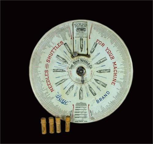 Boye Brand Needles and Shuttles round tin dispenser w/contents. Good Cond.