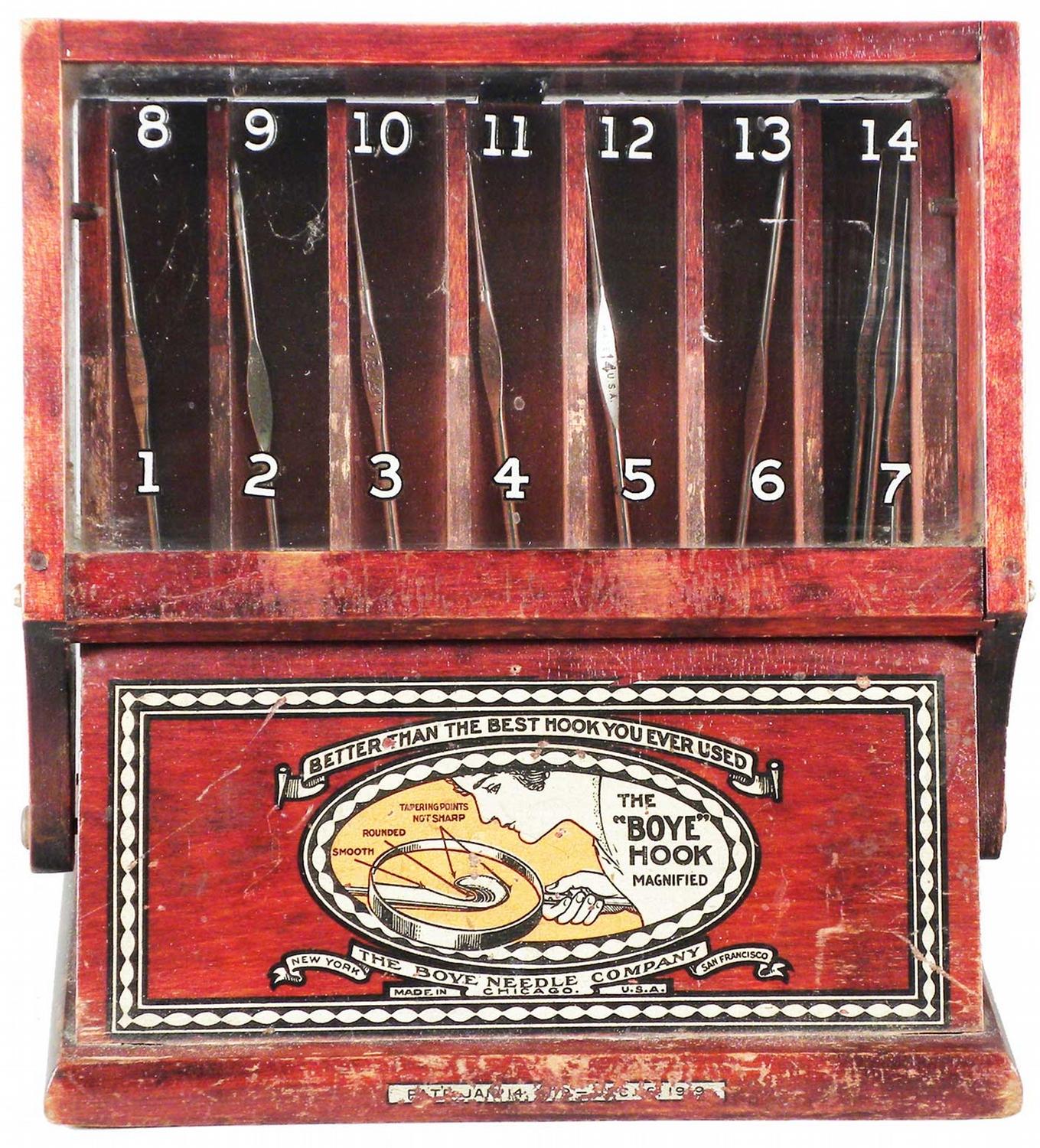 Boye Crochet Hook Store Display. Wood and glass with original stenciling. The Boye Needle Company, Chicago, New York and San Francisco. Comes with product. Excellent condition. 7 1/4 X 7 3/4 X 5 1/2 inches.