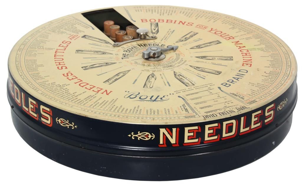 Boye Needle Co. Store Display Cabinet. Round tin cabinet contains needles, shuttles & bobbins in 29 different types and sizes and fitting various brand machines listed on the top of the container; has a center nickel plated indicator arrow which rotates the rack placing the indicated tube slots under the sliding door. Has turned wood tubes with flanged collars and lids, stamped on the top with the indicated number for the needles and the price. In very good condition, rack rotates smoothly and the exterior decoration & lettering is clean and bright with no dings, dents or losses. 16 in. dia. x 3.25 in. high.