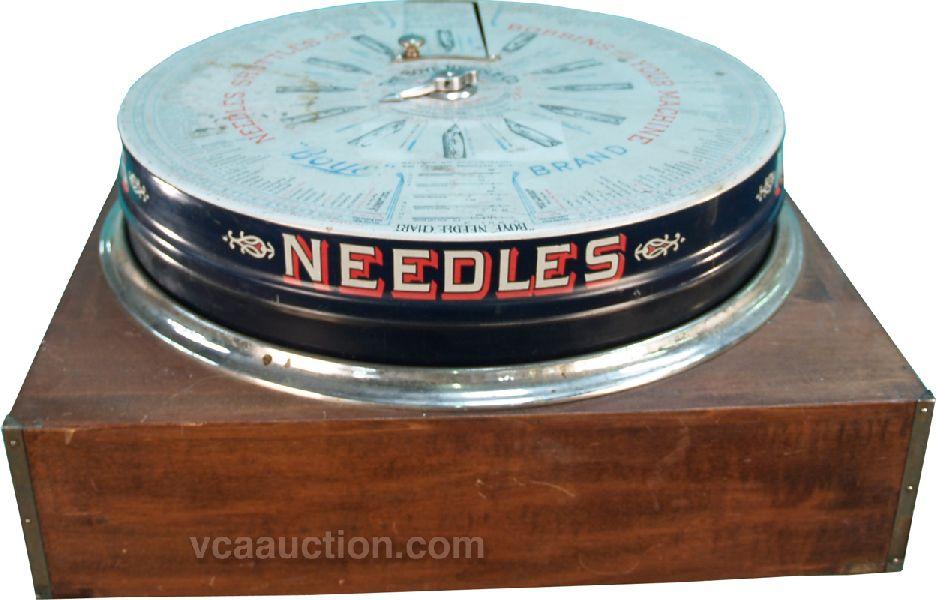 Boye Sewing Needle General Store Metal Countertop Display Case, "Boye Brand Needles, Shuttles & Bobbins For Your Machine" w/ drawer divided into compartments for additonal sewing machine parts, on wood base - 18" x 18"