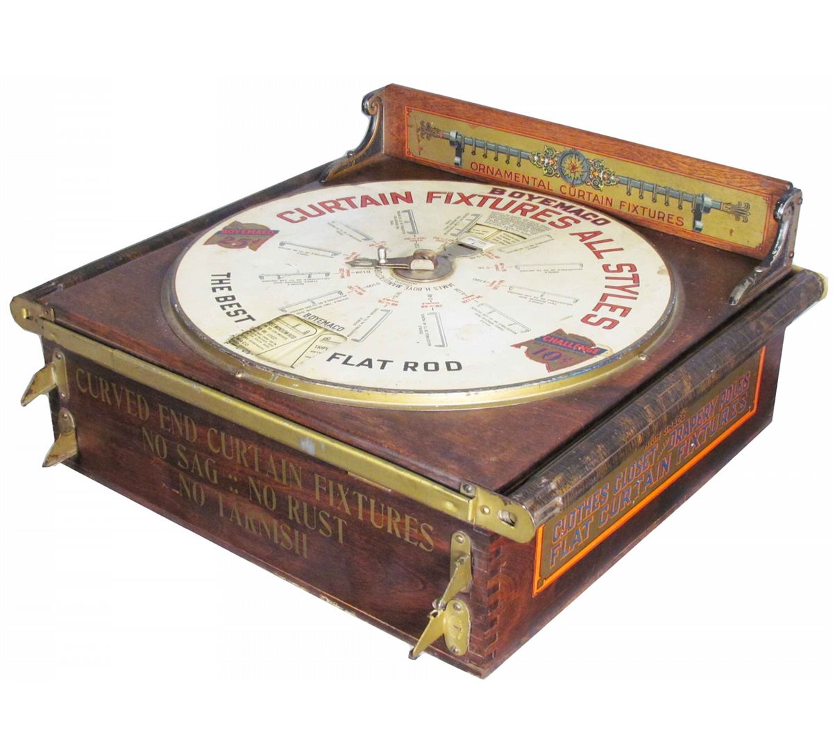 Boyemaco Ornamental Curtain Fixture Store Display with product. Wood cabinet with tin rotating selling wheel. Original decals, very good condition. 18 x 8 X 17 inches.