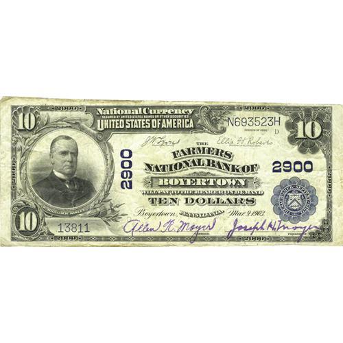 <B>Boyertown, PA</B></I> - $10 1902 Plain Back Fr. 624 <B>The Farmers NB</B></I> Ch. # 2900<BR>A handful of large size notes are known on this institution, all of which are circulated save for a single note. This piece is <B>Fine-Very Fine</B></I> with original paper and the signatures of Allen R. Moyer and Joseph H. Moyer in blue ink.