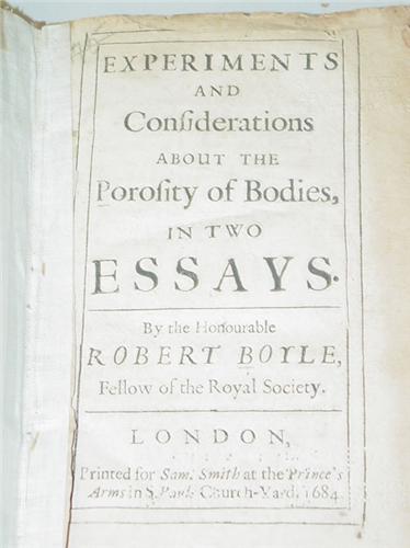 Boyle, Robert. Experiments and Considerations About the Porosity of Bodies, in Two Essays & A Tract: New Experiments About the Preservation of Bodies in Vacuo Boyliano - 2 Books in One. : , . First Edition. 12mo - over 6¾" - 7¾" tall. Hard Cover. Ex-Library. Good Condition. ***Experiments and Considerations... (1684) London: Printed for Sam. Smith, (iv) 145, (3 blank). ***New Experiments about the Preservation... (1674) London: Printed by William Godbid, (ii) 17pp (3 blank). Bound in leather, with blind stamped ruling, new cloth backstrip, front hinge taped to title page, back hinge split, binding broken with pages 111 to end, detached as one unit. Occasional foxing, occasional small burn holes (one affecting the text), tear on 1 page, ownership name on page 1 of book 1 "Oliver Noyoss Book 1694".