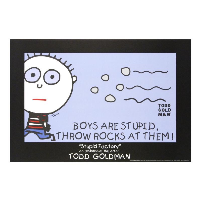 ADD THE IRREVERENT ARTWORK OF WORLD-RENOWNED ARTIST TODD GOLDMAN TO YOUR COLLECTION! Pop artist Todd Goldman is known all across the globe for his whip-smart and wickedly funny puns and pictures! "Boys Are Stupid, Throw Rocks At Them!" is a fine art litho poster hand signed by Todd. Measures approx. 36" x 24" (poster).
