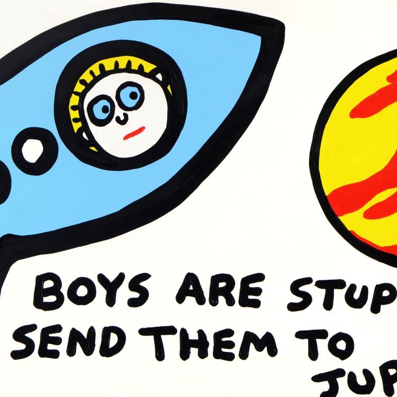 "Boys Are Stupider" is an original acrylic painting on canvas by Todd Goldman, hand signed by the artist. This piece comes gallery wrapped. Includes Certificate of Authenticity. Measures approx. 48" x 24" (image). There is minor wear on the corners and ed