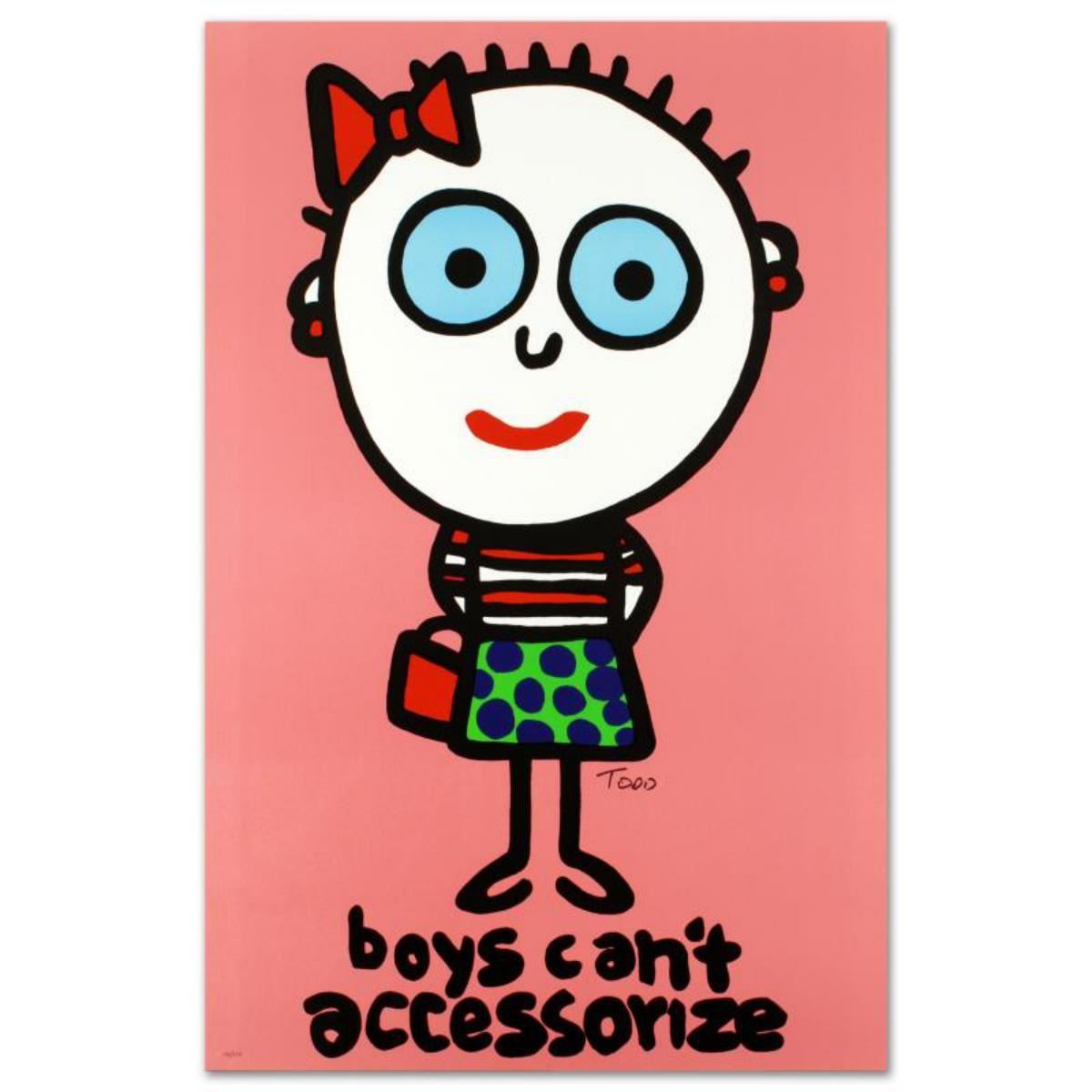 Pop artist Todd Goldman is known all across the globe for his whip-smart and wickedly funny puns and pictures! "Boys Can't Accessorize" is a limited edition lithograph on paper, numbered and hand signed by Todd. Includes Certificate of Authenticity! Measures approx. 23" x 35" (no border). Reference #: 167839.
