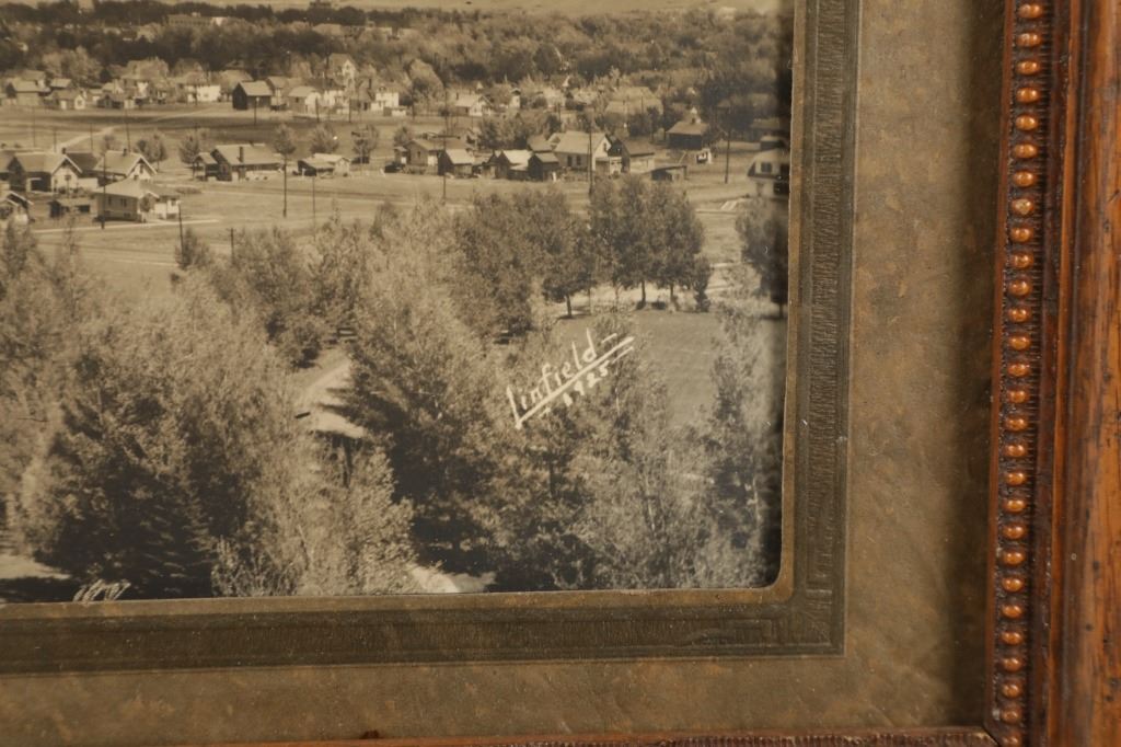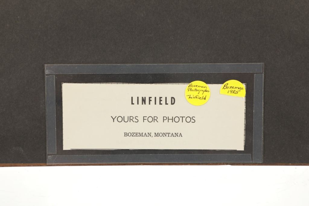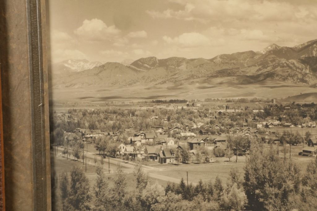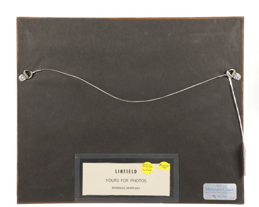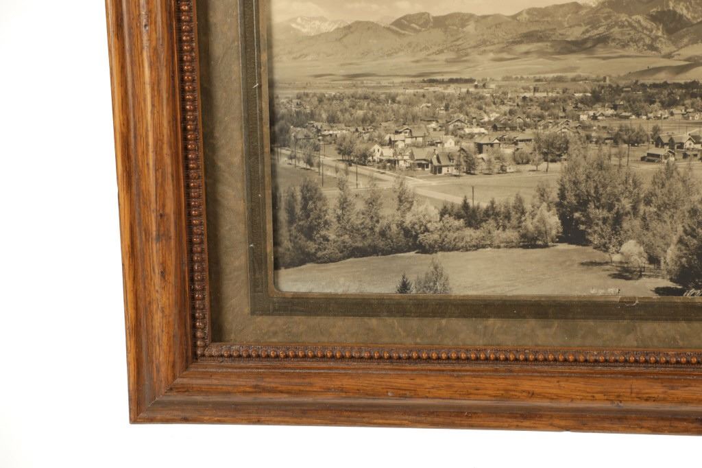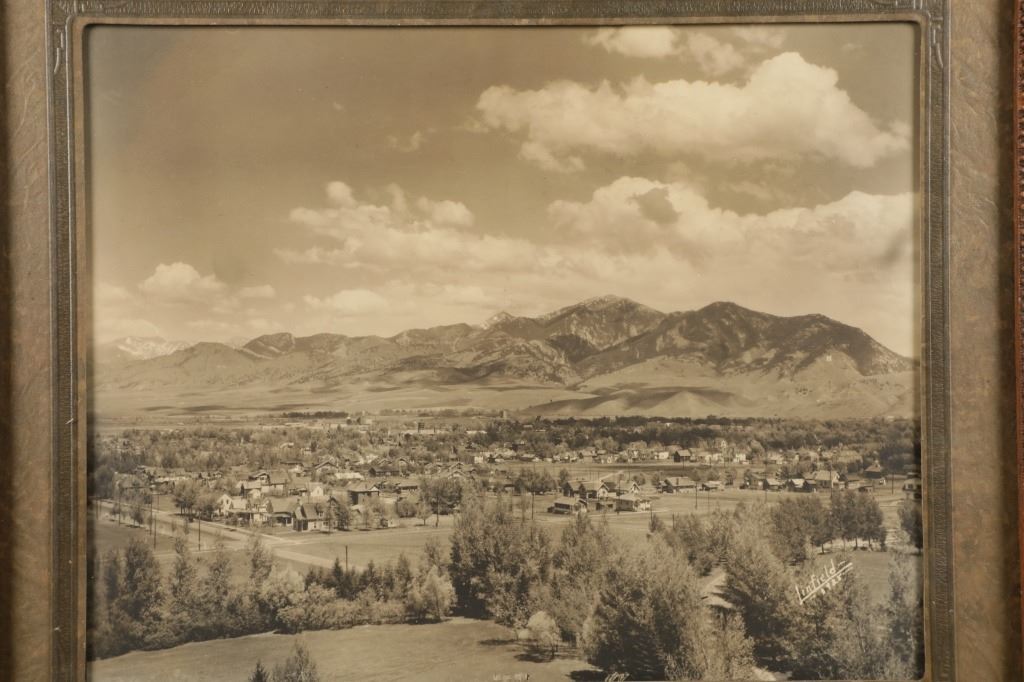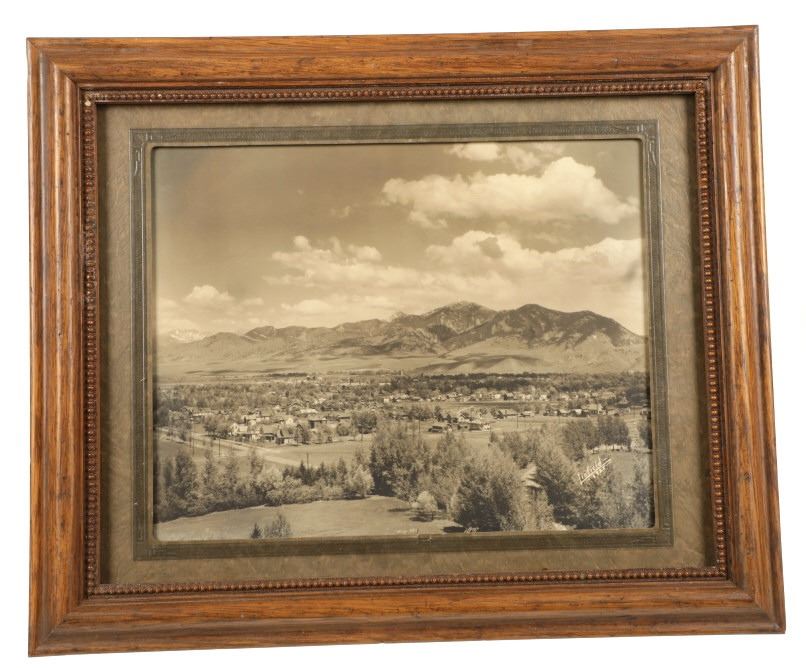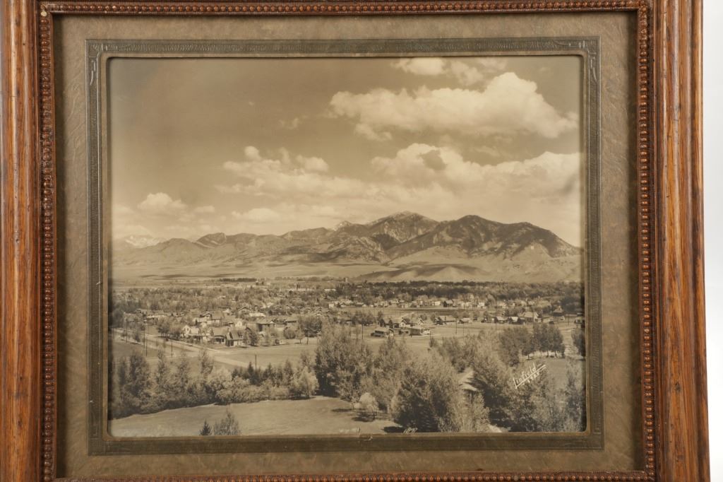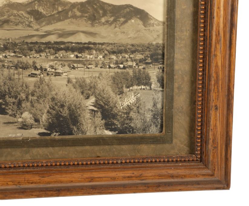 Featured in this lot is this framed photo of Bozeman taken in 1925 by Frederic B. Linfield. The photo was taken by Frederic Bloomfield Linfield, a professor of agriculture who taught at Montana State College from 1902 to 1913. The photo shows early Bozeman from atop a hill, showing the Bridger mountain range in the background with snow capped peaks and the "M" trail on the far right. The photo is signed on the bottom right reading, "Linfield 1925". The photo is set in a nice wooden frame and matted once. The photo and frame are in good condition overall with no signs of obvious damage. The piece measures 11 3/8" L x 13 3/4" W.