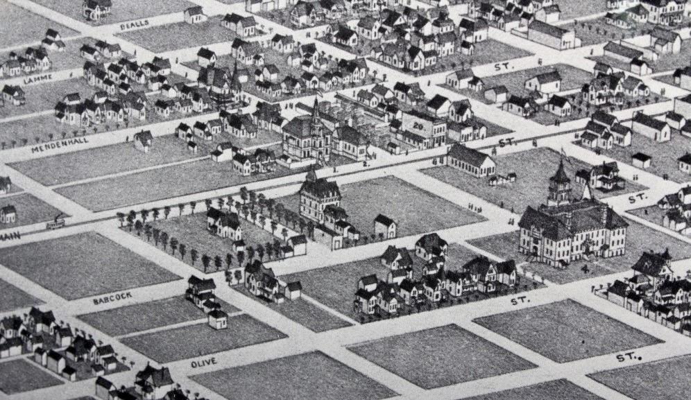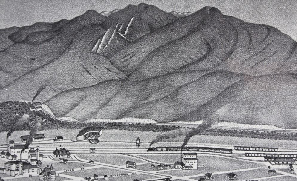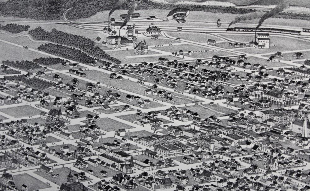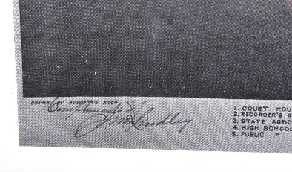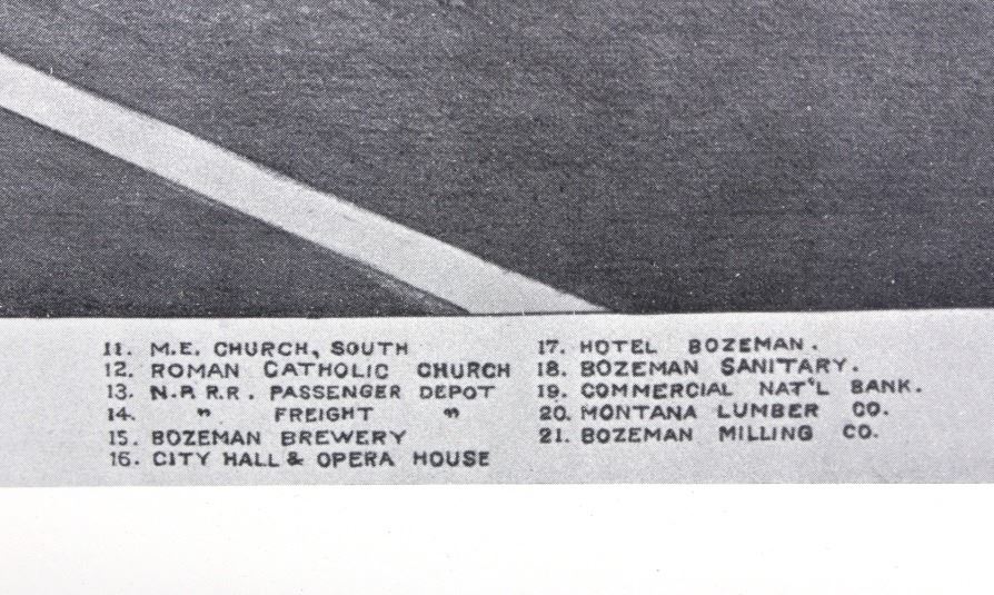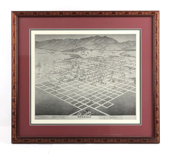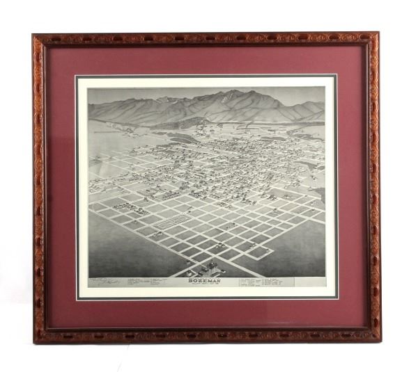 This is a contemporary bird's eye view framed print of Bozeman, Montana. The piece is marked at the bottom "Bird's Eye View of the City of Bozeman Gallatin County, Mont. 1898". The print shows a unique early view of Bozeman near the turn of the century. It has been professionally framed and is in very good condition. The frame measures 23" x 26".