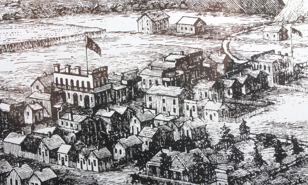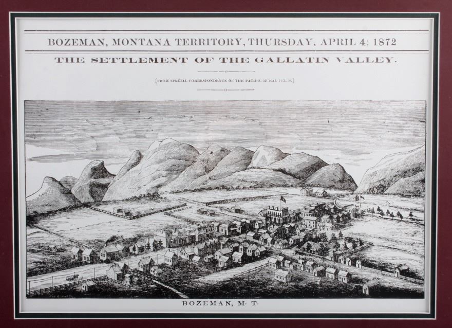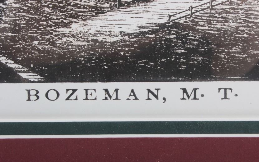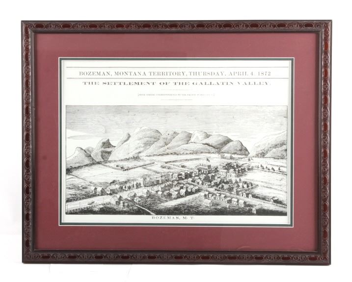 This is a contemporary framed print of Bozeman, Montana Territory. The piece shows an early image of Bozeman in 1872. The print has been professionally framed and shows good condition. The frame measures 21" x 26.5".