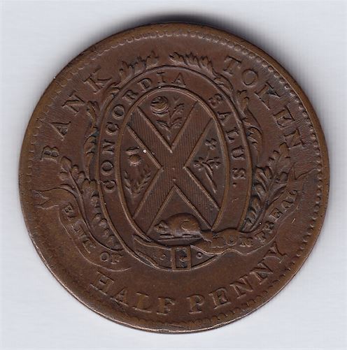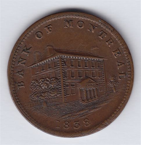 Br. 524. Bank of Montreal Sideview Halfpenny, 1838. Not a Loye specimen. - Courteau 31. CH LC-10A3. Copper. 9.89 grams. AU, 4 light scratches above roof. More complete obv. beading. Thin flan, flat rim.