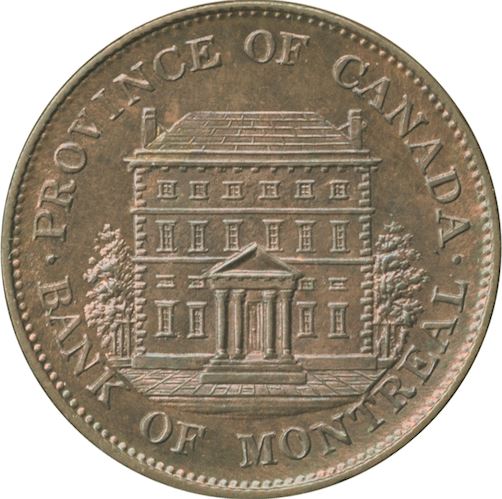 Br. 527. Bank of Montreal Front View Halfpenny, 1844. - CH PC-1B3. Heavy trees. Top right serif of "t" deformed, which letter touches walk. Unc, 30% red on obv., and 70% red on rev.