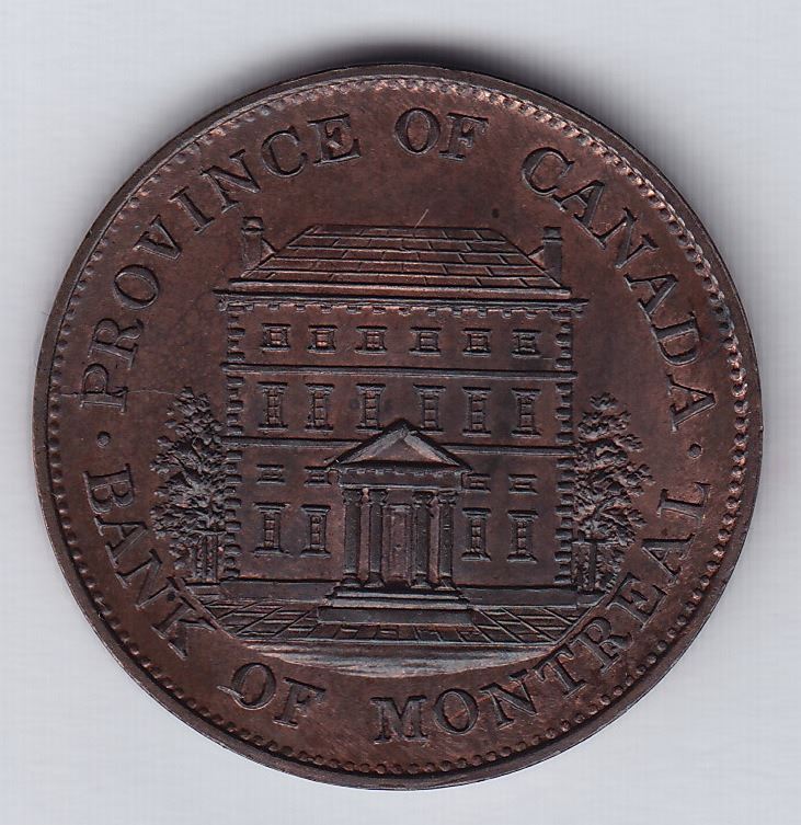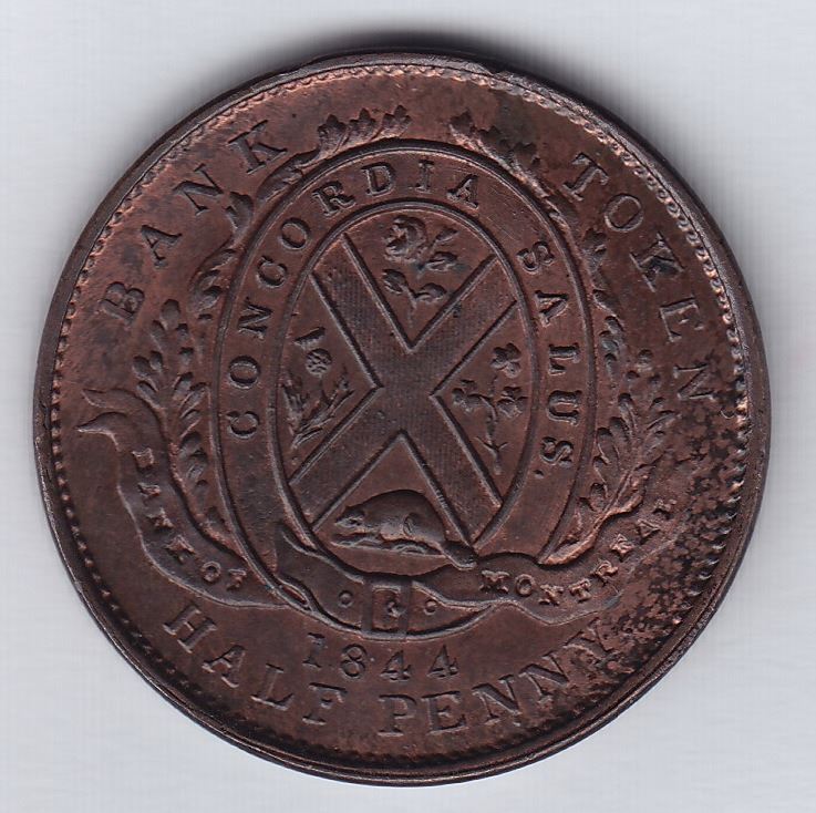 CH PC-1B3. Curved break from border touching bead to top of left upright of "n" in "Province"continuing through that letter and turning outward at its centre, and as well two other parallel thin breaks from serif of same letter at right extending to chimney; another from bead above "P" in "Province" through right side of the upright, through right serif, to top leaf of tree. Unc., about 20% lustre and choice as are virtually all of the Loye 1844 ½ pennies, but a corrosion? spot on upper rev. border at right.